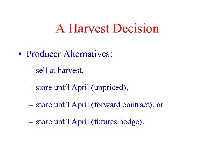A Harvest Decision • Producer Alternatives: – sell at harvest, – store until April (unpriced), – store until April (forward contract), or – store until April (futures hedge).
