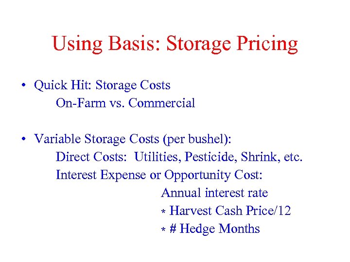 Using Basis: Storage Pricing • Quick Hit: Storage Costs On-Farm vs. Commercial • Variable Storage Costs (per bushel): Direct Costs: Utilities, Pesticide, Shrink, etc. Interest Expense or Opportunity Cost: Annual interest rate * Harvest Cash Price/12 * # Hedge Months