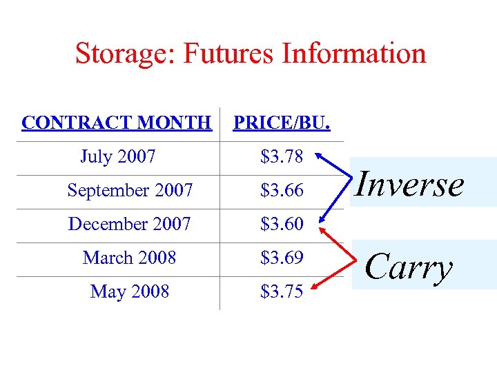 Storage: Futures Information CONTRACT MONTH PRICE/BU. July 2007 $3. 78 September 2007 $3. 66 December 2007 $3. 60 March 2008 $3. 69 May 2008 $3. 75 Inverse Carry