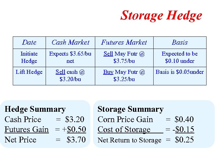Storage Hedge Date Cash Market Futures Market Basis Initiate Hedge Expects $3. 65/bu net Sell May Futr @ $3. 75/bu Expected to be $0. 10 under Lift Hedge Sell cash @ $3. 20/bu Buy May Futr @ $3. 25/bu Basis is $0. 05 under Hedge Summary Cash Price = $3. 20 Futures Gain = +$0. 50 Net Price = $3. 70 Storage Summary Corn Price Gain = $0. 40 Cost of Storage = -$0. 15 Net Return to Storage = $0. 25
