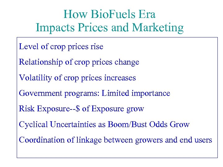 How Bio. Fuels Era Impacts Prices and Marketing Level of crop prices rise Relationship of crop prices change Volatility of crop prices increases Government programs: Limited importance Risk Exposure--$ of Exposure grow Cyclical Uncertainties as Boom/Bust Odds Grow Coordination of linkage between growers and end users