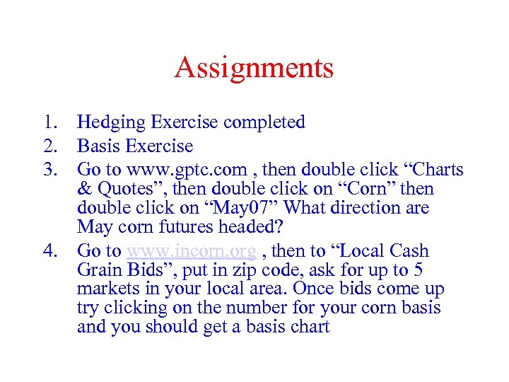 Assignments 1. Hedging Exercise completed 2. Basis Exercise 3. Go to www. gptc. com , then double click “Charts & Quotes”, then double click on “Corn” then double click on “May 07” What direction are May corn futures headed? 4. Go to www. incorn. org , then to “Local Cash Grain Bids”, put in zip code, ask for up to 5 markets in your local area. Once bids come up try clicking on the number for your corn basis and you should get a basis chart