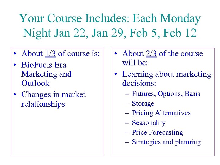 Your Course Includes: Each Monday Night Jan 22, Jan 29, Feb 5, Feb 12 • About 1/3 of course is: • Bio. Fuels Era Marketing and Outlook • Changes in market relationships • About 2/3 of the course will be: • Learning about marketing decisions: – – – Futures, Options, Basis Storage Pricing Alternatives Seasonality Price Forecasting Strategies and planning