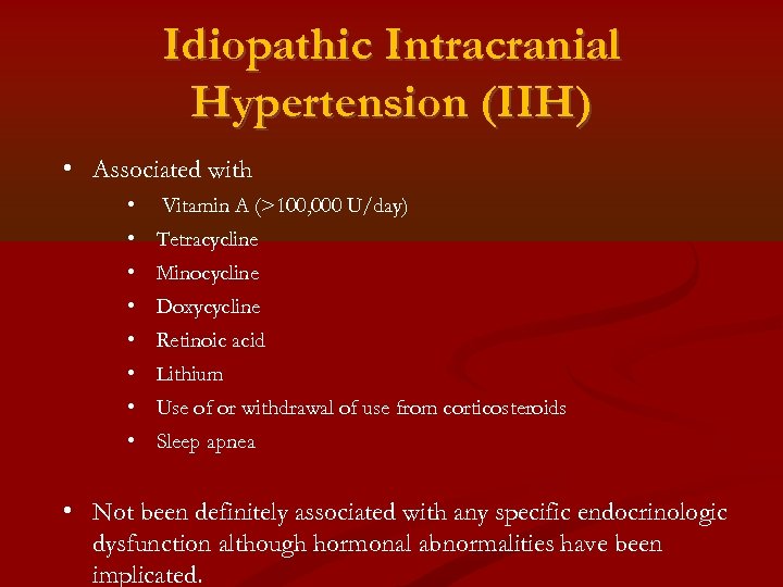 Idiopathic Intracranial Hypertension (IIH) • Associated with • Vitamin A (>100, 000 U/day) • Tetracycline • Minocycline • Doxycycline • Retinoic acid • Lithium • Use of or withdrawal of use from corticosteroids • Sleep apnea • Not been definitely associated with any specific endocrinologic dysfunction although hormonal abnormalities have been implicated.