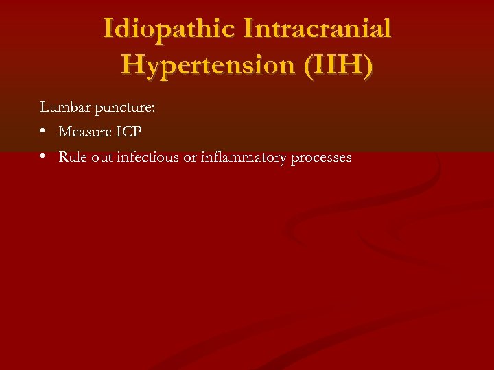 Idiopathic Intracranial Hypertension (IIH) Lumbar puncture: • Measure ICP • Rule out infectious or inflammatory processes