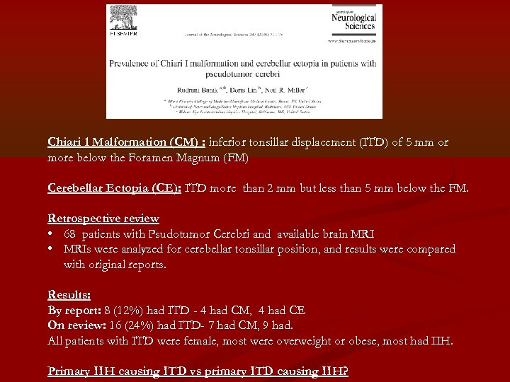 Chiari 1 Malformation (CM) : inferior tonsillar displacement (ITD) of 5 mm or more below the Foramen Magnum (FM) Cerebellar Ectopia (CE): ITD more than 2 mm but less than 5 mm below the FM. Retrospective review • 68 patients with Psudotumor Cerebri and available brain MRI • MRIs were analyzed for cerebellar tonsillar position, and results were compared with original reports. Results: By report: 8 (12%) had ITD - 4 had CM, 4 had CE On review: 16 (24%) had ITD- 7 had CM, 9 had. All patients with ITD were female, most were overweight or obese, most had IIH. Primary IIH causing ITD vs primary ITD causing IIH?