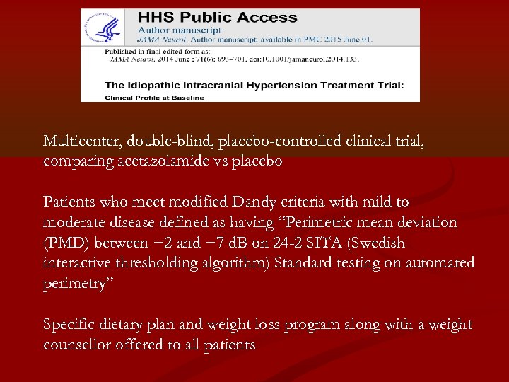 Multicenter, double-blind, placebo-controlled clinical trial, comparing acetazolamide vs placebo Patients who meet modified Dandy criteria with mild to moderate disease defined as having “Perimetric mean deviation (PMD) between − 2 and − 7 d. B on 24 -2 SITA (Swedish interactive thresholding algorithm) Standard testing on automated perimetry” Specific dietary plan and weight loss program along with a weight counsellor offered to all patients