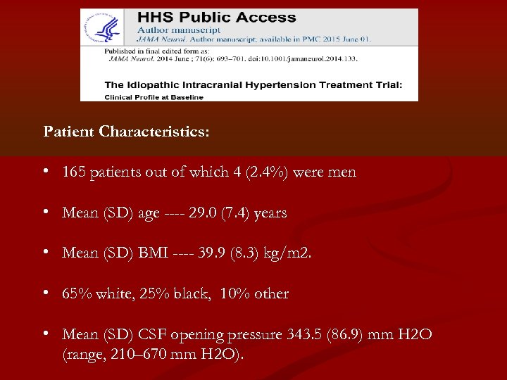 Patient Characteristics: • 165 patients out of which 4 (2. 4%) were men • Mean (SD) age ---- 29. 0 (7. 4) years • Mean (SD) BMI ---- 39. 9 (8. 3) kg/m 2. • 65% white, 25% black, 10% other • Mean (SD) CSF opening pressure 343. 5 (86. 9) mm H 2 O (range, 210– 670 mm H 2 O).