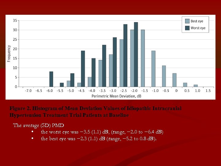 Figure 2. Histogram of Mean Deviation Values of Idiopathic Intracranial Hypertension Treatment Trial Patients at Baseline The average (SD) PMD • the worst eye was − 3. 5 (1. 1) d. B, (range, − 2. 0 to − 6. 4 d. B) • the best eye was − 2. 3 (1. 1) d. B (range, − 5. 2 to 0. 8 d. B).