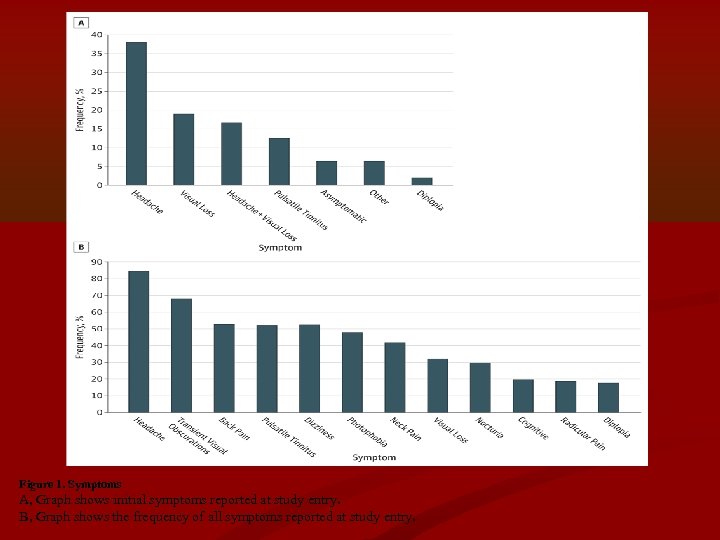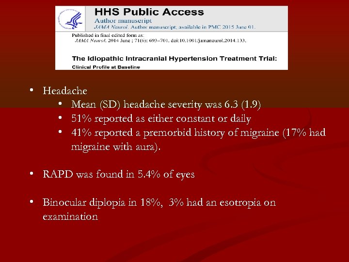 • Headache • Mean (SD) headache severity was 6. 3 (1. 9) • 51% reported as either constant or daily • 41% reported a premorbid history of migraine (17% had migraine with aura). • RAPD was found in 5. 4% of eyes • Binocular diplopia in 18%, 3% had an esotropia on examination