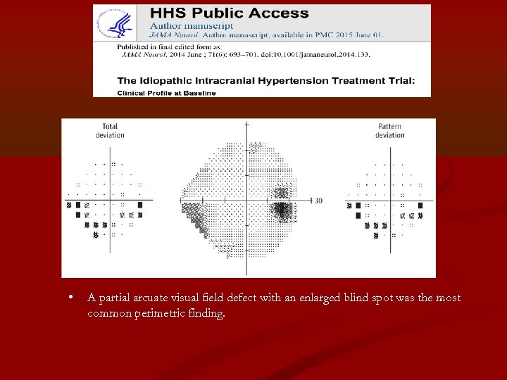 • A partial arcuate visual field defect with an enlarged blind spot was the most common perimetric finding.