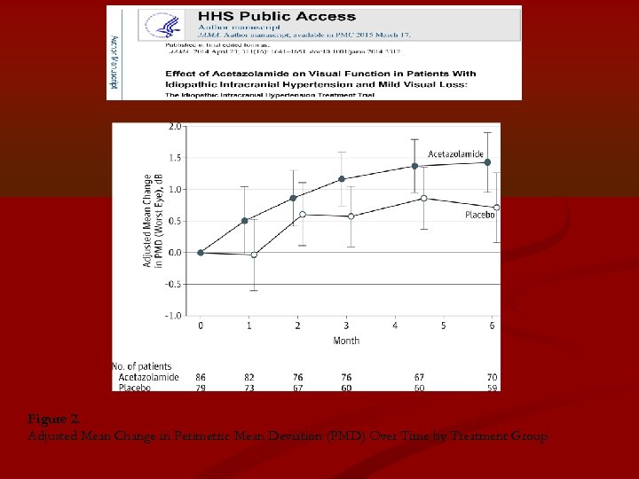• Mean improvement in papilledema grade • acetazolamide: − 1. 31, from 2. 76 to 1. 45 • placebo: − 0. 61, from 2. 76 to 2. 15 • Rx effect: − 0. 70; 95% CI, − 0. 99 to − 0. 41; P <. 001) • Vision-related quality of life (National Eye Institute VFQ-25) • acetazolamide: 8. 33, from 82. 97 to 91. 30 • placebo: 1. 98, from 82. 97 to 84. 95 • Rx effect: 6. 35; 95% CI, 2. 22 to 10. 47; P =. 003) • Reduction in weight • acetazolamide: − 7. 50 kg, from 107. 72 kg to 100. 22 kg • placebo: − 3. 45 kg, from 107. 72 kg to 104. 27 kg • Rx effect: − 4. 05 kg, 95% CI, − 6. 27 to − 1. 83 kg; P <. 001).