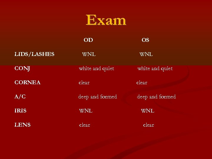 Exam OD LIDS/LASHES OS WNL CONJ white and quiet CORNEA clear A/C deep and formed IRIS WNL LENS clear