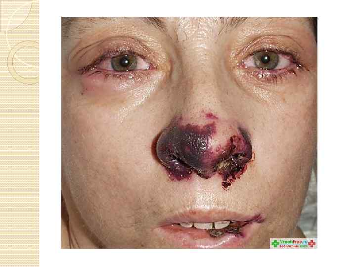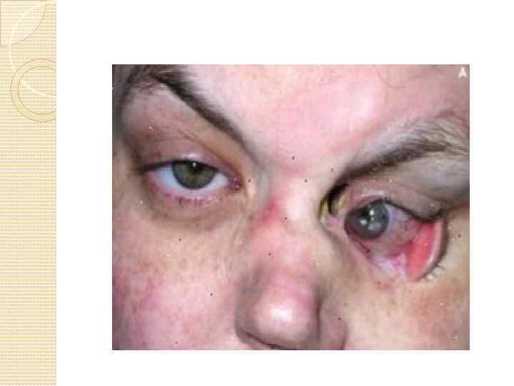 Ураження дихальних шляхів Дихальні шляхи (верхні або нижні відділи або поєднані зміни) уражаються у всіх хворих з синдромом Вегенера, а синуси залучаються до процесу у 90%. Власне гранулематозні синусити часто ускладнюються вторинною гнійною інфекцією, що вимагає додаткової активної антибіотикотерапії і, часто, неправильно оцінюється як загострення основного захворювання. Нерідко перші ознаки ураження носоглотки вельми скромні, і лише через кілька місяців розвиваються симптоми системного захворювання. Описано окремі хворі, у яких генералізація хвороби настає через кілька років після виникнення її перших неважких проявів. Прогресування уражень носоглотки з поширенням гранулематозной тканини може призводити до руйнування носової перегородки і западанням спинки носа ( «сідлоподібний ніс» ), здавлення орбіти і випинання очного яблука вперед і вниз (проптоз) внаслідок ретробульбарного гранулематозного запалення, деструкції тканин очного яблука і орбіти. У той же час перфорація твердого або м'якого піднебіння нехарактерна для гранулематоза Вегенера і дає підставу запідозрити наявність так званої гранульоми середньої лінії