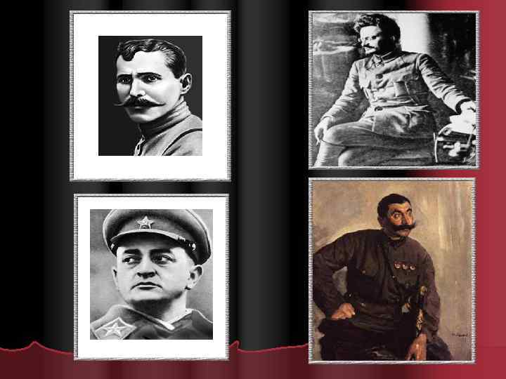 Красная армия l 10 июля 1918 г. Введена всеобщая воинская повинность от 18 до 40 лет. Весна 1919 численность Красной Армии 1, 5 млн. Военкомы с чрезвычайными полномочиями. . Восточный фронт- С Каменев, Фрунзе М. , М. Тухачевский. Южный фронт : А. Егоров, С. Буденный, К. Ворошилов. Красные командиры: В. Чапаев, Щорс, Фурманов и др.