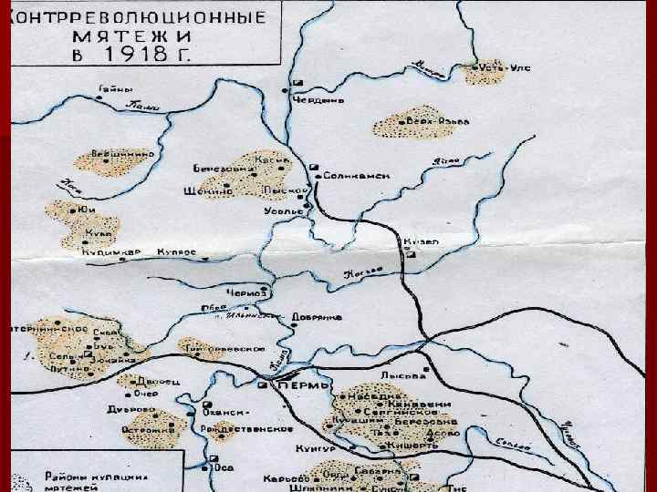 Установление Советской власти в Прикамье n n n n 17 декабря 1917 года председатель Пермского городского Совета рабочих и солдатских депутатов А. Л. Борчанинов объявил об окончательной победе Советской власти в Прикамье. Не все сразу признали власть большевиков. Начались бунты. Наиболее серьезные выступления произошли в первой половине 1918 года в сёлах Сепыч, Григорьевское, Вознесеннское, Сива, У- Буб; городах: Оса, Кунгур, Кизел, Чусовой. Недовольства возникали из- за: 1) Введения продовольственной диктатуры 2) Мобилизации крестьян в Красную Армию. 3) Произвола продработников. Это была локальная ГВ. А. Л. Борчанинов