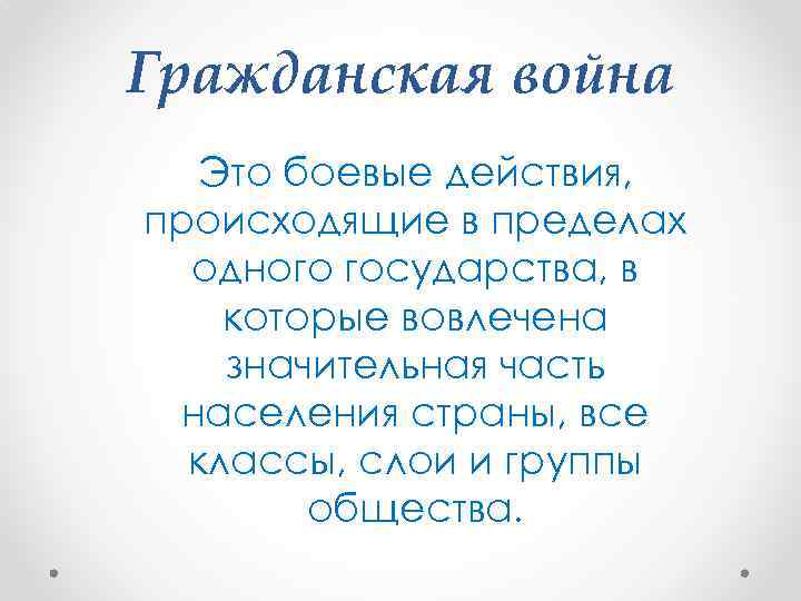 Гражданская война Это боевые действия, происходящие в пределах одного государства, в которые вовлечена значительная часть населения страны, все классы, слои и группы общества.