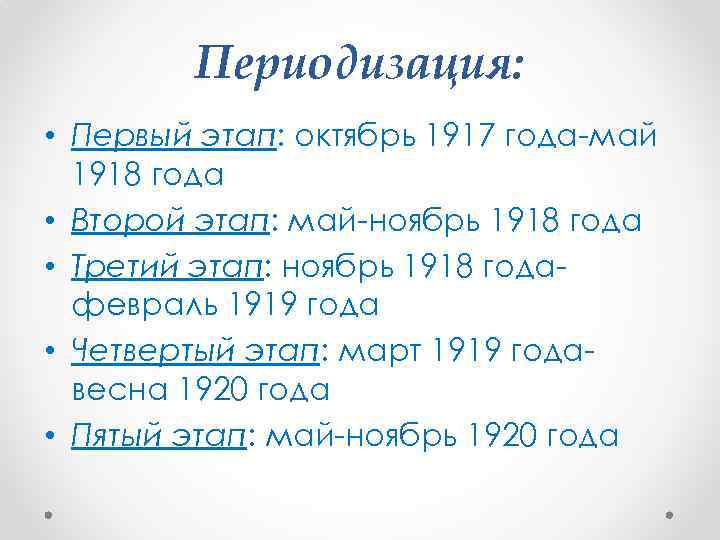Периодизация: • Первый этап: октябрь 1917 года-май 1918 года • Второй этап: май-ноябрь 1918 года • Третий этап: ноябрь 1918 годафевраль 1919 года • Четвертый этап: март 1919 годавесна 1920 года • Пятый этап: май-ноябрь 1920 года