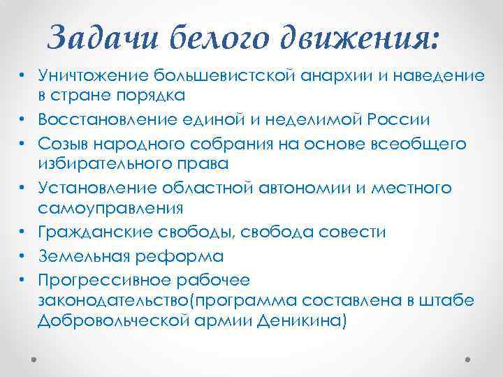 Задачи белого движения: • Уничтожение большевистской анархии и наведение в стране порядка • Восстановление единой и неделимой России • Созыв народного собрания на основе всеобщего избирательного права • Установление областной автономии и местного самоуправления • Гражданские свободы, свобода совести • Земельная реформа • Прогрессивное рабочее законодательство(программа составлена в штабе Добровольческой армии Деникина)