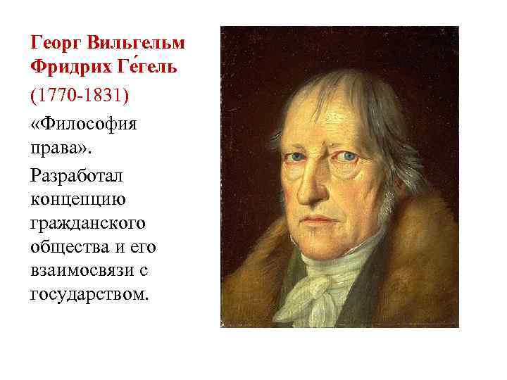 Георг Вильгельм Фридрих Ге гель (1770 -1831) «Философия права» . Разработал концепцию гражданского общества и его взаимосвязи с государством.