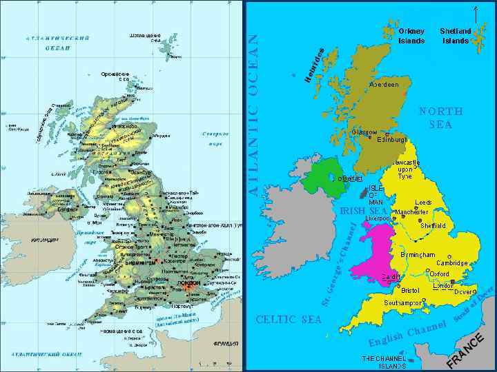 The British Isles To the northwest of Europe you can see the British Isles which consist of two large islands: Great Britain and Ireland about five thousand small islands. The British Isles are separated from the European continent by the English Channel. The west coast is washed by the Atlantic Ocean and the Irish Sea; the east coast is washed by the North Sea.