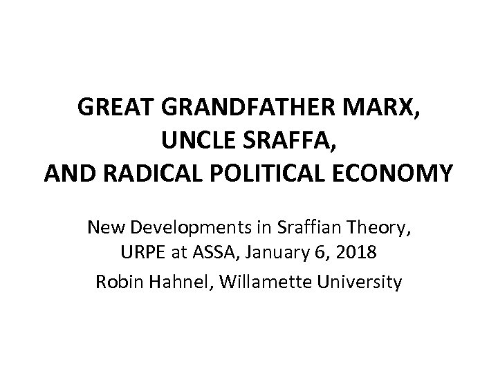 GREAT GRANDFATHER MARX, UNCLE SRAFFA, AND RADICAL POLITICAL ECONOMY New Developments in Sraffian Theory, URPE at ASSA, January 6, 2018 Robin Hahnel, Willamette University