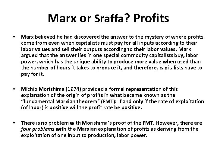 Marx or Sraffa? Profits • Marx believed he had discovered the answer to the mystery of where profits come from even when capitalists must pay for all inputs according to their labor values and sell their outputs according to their labor values. Marx argued that the answer lies in one special commodity capitalists buy, labor power, which has the unique ability to produce more value when used than the number of hours it takes to produce it, and therefore, capitalists have to pay for it. • Michio Morishima (1974) provided a formal representation of this explanation of the origin of profits in what became known as the “fundamental Marxian theorem” (FMT): If and only if the rate of exploitation (of labor) is positive will the profit rate be positive. • There is no problem with Morishima’s proof of the FMT. However, there are four problems with the Marxian explanation of profits as deriving from the exploitation of one input to production, labor power.