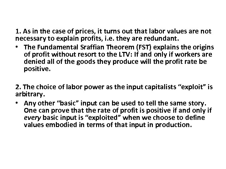 1. As in the case of prices, it turns out that labor values are not necessary to explain profits, i. e. they are redundant. • The Fundamental Sraffian Theorem (FST) explains the origins of profit without resort to the LTV: If and only if workers are denied all of the goods they produce will the profit rate be positive. 2. The choice of labor power as the input capitalists “exploit” is arbitrary. • Any other “basic” input can be used to tell the same story. One can prove that the rate of profit is positive if and only if every basic input is “exploited” when we choose to define values embodied in terms of that input in production.
