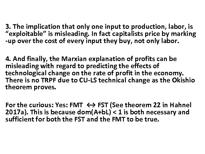 3. The implication that only one input to production, labor, is “exploitable” is misleading. In fact capitalists price by marking -up over the cost of every input they buy, not only labor. 4. And finally, the Marxian explanation of profits can be misleading with regard to predicting the effects of technological change on the rate of profit in the economy. There is no TRPF due to CU-LS technical change as the Okishio theorem proves. For the curious: Yes: FMT ↔ FST (See theorem 22 in Hahnel 2017 a). This is because dom(A+b. L) < 1 is both necessary and sufficient for both the FST and the FMT to be true.
