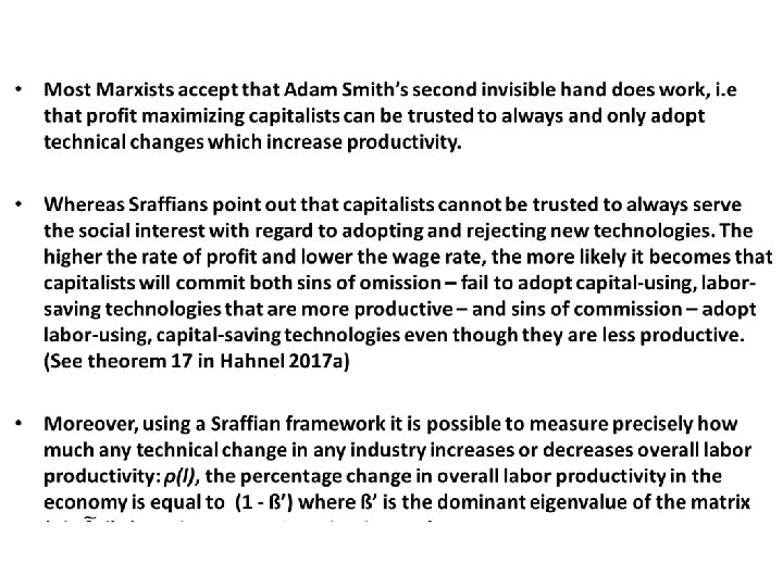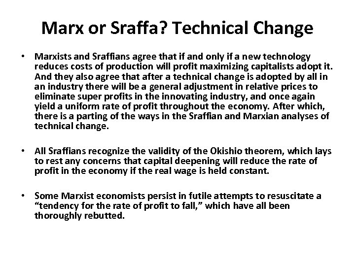 Marx or Sraffa? Technical Change • Marxists and Sraffians agree that if and only if a new technology reduces costs of production will profit maximizing capitalists adopt it. And they also agree that after a technical change is adopted by all in an industry there will be a general adjustment in relative prices to eliminate super profits in the innovating industry, and once again yield a uniform rate of profit throughout the economy. After which, there is a parting of the ways in the Sraffian and Marxian analyses of technical change. • All Sraffians recognize the validity of the Okishio theorem, which lays to rest any concerns that capital deepening will reduce the rate of profit in the economy if the real wage is held constant. • Some Marxist economists persist in futile attempts to resuscitate a “tendency for the rate of profit to fall, ” which have all been thoroughly rebutted.