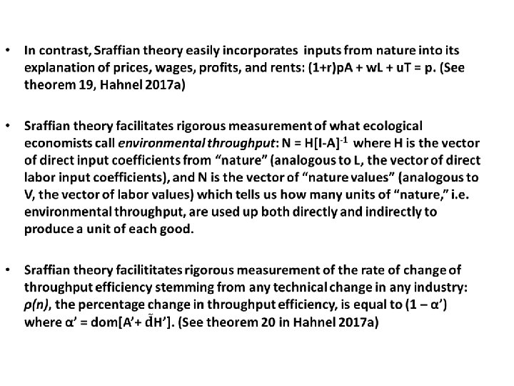• And because we can rigorously measure both the percentage change in labor productivity and the percentage change in throughput efficiency in a Sraffian framework, it is now possible to stipulate a sufficient condition for environmental sustainability: • Assuming no change in hours worked and the composition of output, as long as ρ(l), the rate of growth of labor productivity, does not exceed ρ(n), the rate of growth of throughput efficiency, environmental throughput will not increase. • In effect a Sraffian treatment of the environment demonstrates that environmental sustainability reduces to whether or not increases in throughput efficiency keep pace with increases in labor productivity, or, as environmental economists put it, on whether or not we can sufficiently “de-couple” growth of output from growth of throughput -- which allows us to finally sort out the “sense” from the “nonsense” in the steady-state and de-growth literatures.