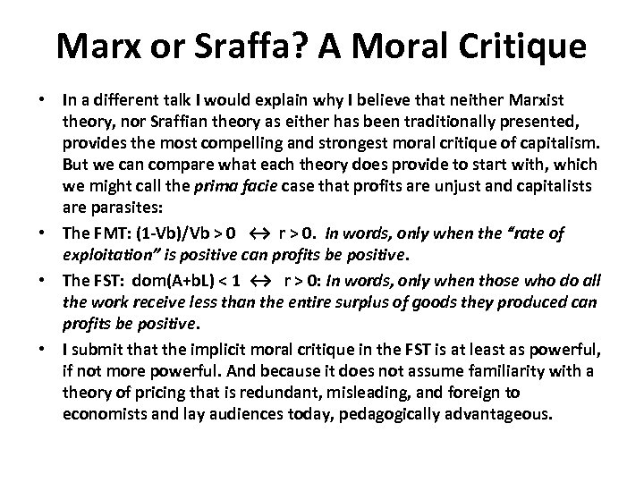 Marx or Sraffa? A Moral Critique • In a different talk I would explain why I believe that neither Marxist theory, nor Sraffian theory as either has been traditionally presented, provides the most compelling and strongest moral critique of capitalism. But we can compare what each theory does provide to start with, which we might call the prima facie case that profits are unjust and capitalists are parasites: • The FMT: (1 -Vb)/Vb > 0 ↔ r > 0. In words, only when the “rate of exploitation” is positive can profits be positive. • The FST: dom(A+b. L) < 1 ↔ r > 0: In words, only when those who do all the work receive less than the entire surplus of goods they produced can profits be positive. • I submit that the implicit moral critique in the FST is at least as powerful, if not more powerful. And because it does not assume familiarity with a theory of pricing that is redundant, misleading, and foreign to economists and lay audiences today, pedagogically advantageous.