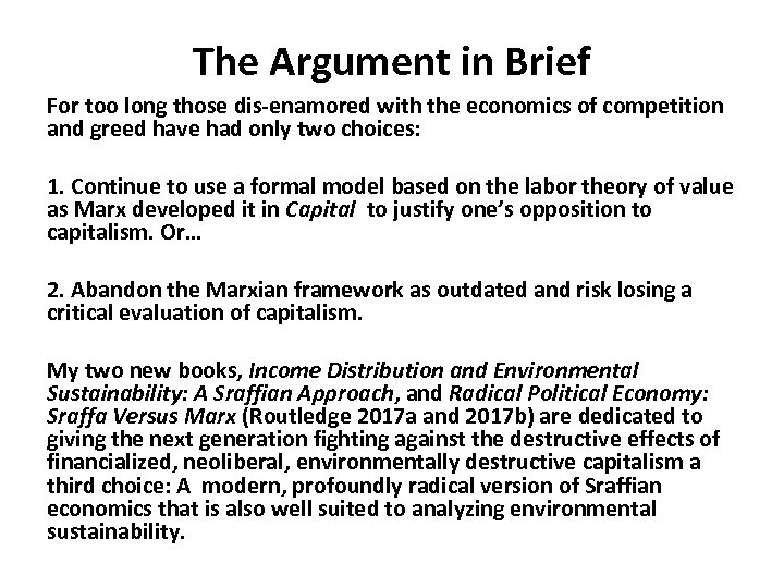 The Argument in Brief For too long those dis-enamored with the economics of competition and greed have had only two choices: 1. Continue to use a formal model based on the labor theory of value as Marx developed it in Capital to justify one’s opposition to capitalism. Or… 2. Abandon the Marxian framework as outdated and risk losing a critical evaluation of capitalism. My two new books, Income Distribution and Environmental Sustainability: A Sraffian Approach, and Radical Political Economy: Sraffa Versus Marx (Routledge 2017 a and 2017 b) are dedicated to giving the next generation fighting against the destructive effects of financialized, neoliberal, environmentally destructive capitalism a third choice: A modern, profoundly radical version of Sraffian economics that is also well suited to analyzing environmental sustainability.