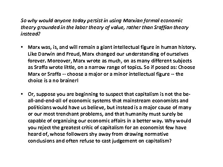 So why would anyone today persist in using Marxian formal economic theory grounded in the labor theory of value, rather than Sraffian theory instead? • Marx was, is, and will remain a giant intellectual figure in human history. Like Darwin and Freud, Marx changed our understanding of ourselves forever. Moreover, Marx wrote as much, on as many different subjects as Sraffa wrote little, on a narrow range of topics. So if posed as: Choose Marx or Sraffa -- choose a major or a minor intellectual figure -- the choice is a no brainer! • Or, suppose you are beginning to suspect that capitalism is not the beall-and-end-all of economic systems that mainstream economists and politicians would have us believe, but instead is a major cause of many or our most trenchant problems, and that humanity must surely be capable of organizing our economic affairs in a better way. Why would you reject the greatest critic of capitalism for an economist few have heard of, whose followers shy away from drawing normative conclusions and often refuse to cast judgement on capitalism?