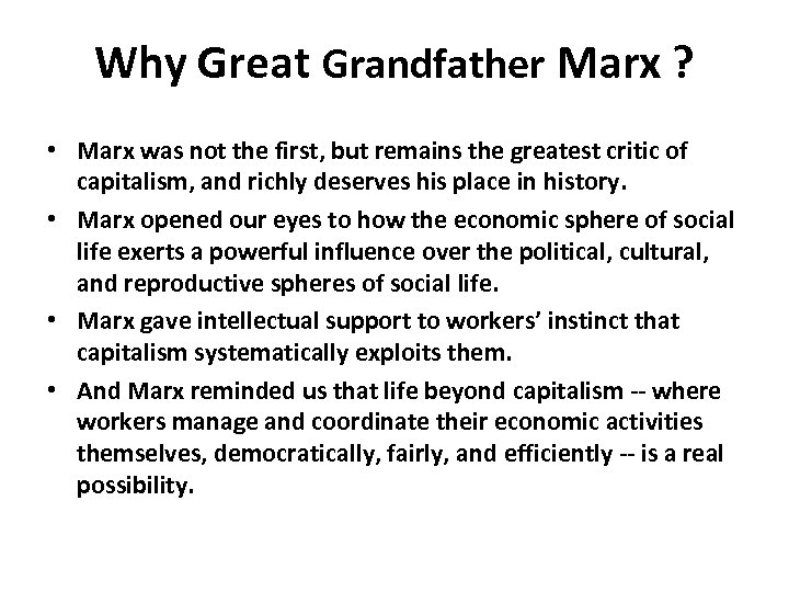 Why Great Grandfather Marx ? • Marx was not the first, but remains the greatest critic of capitalism, and richly deserves his place in history. • Marx opened our eyes to how the economic sphere of social life exerts a powerful influence over the political, cultural, and reproductive spheres of social life. • Marx gave intellectual support to workers’ instinct that capitalism systematically exploits them. • And Marx reminded us that life beyond capitalism -- where workers manage and coordinate their economic activities themselves, democratically, fairly, and efficiently -- is a real possibility.