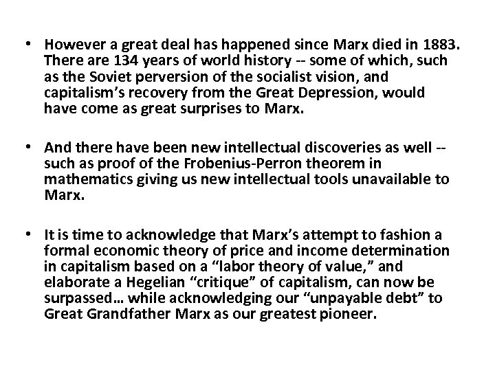 • However a great deal has happened since Marx died in 1883. There are 134 years of world history -- some of which, such as the Soviet perversion of the socialist vision, and capitalism’s recovery from the Great Depression, would have come as great surprises to Marx. • And there have been new intellectual discoveries as well -such as proof of the Frobenius-Perron theorem in mathematics giving us new intellectual tools unavailable to Marx. • It is time to acknowledge that Marx’s attempt to fashion a formal economic theory of price and income determination in capitalism based on a “labor theory of value, ” and elaborate a Hegelian “critique” of capitalism, can now be surpassed… while acknowledging our “unpayable debt” to Great Grandfather Marx as our greatest pioneer.