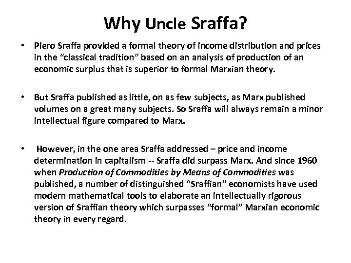 Why Uncle Sraffa? • Piero Sraffa provided a formal theory of income distribution and prices in the “classical tradition” based on an analysis of production of an economic surplus that is superior to formal Marxian theory. • But Sraffa published as little, on as few subjects, as Marx published volumes on a great many subjects. So Sraffa will always remain a minor intellectual figure compared to Marx. • However, in the one area Sraffa addressed – price and income determination in capitalism -- Sraffa did surpass Marx. And since 1960 when Production of Commodities by Means of Commodities was published, a number of distinguished “Sraffian” economists have used modern mathematical tools to elaborate an intellectually rigorous version of Sraffian theory which surpasses “formal” Marxian economic theory in every regard.