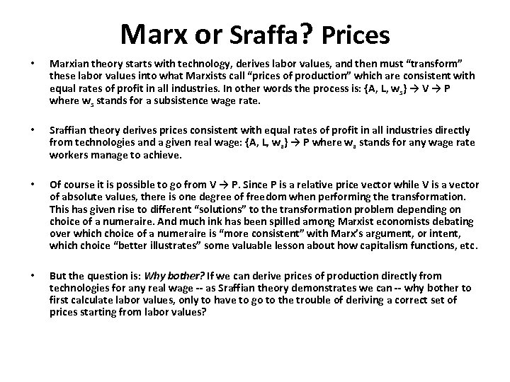 Marx or Sraffa? Prices • Marxian theory starts with technology, derives labor values, and then must “transform” these labor values into what Marxists call “prices of production” which are consistent with equal rates of profit in all industries. In other words the process is: {A, L, ws} → V → P where ws stands for a subsistence wage rate. • Sraffian theory derives prices consistent with equal rates of profit in all industries directly from technologies and a given real wage: {A, L, wa} → P where wa stands for any wage rate workers manage to achieve. • Of course it is possible to go from V → P. Since P is a relative price vector while V is a vector of absolute values, there is one degree of freedom when performing the transformation. This has given rise to different “solutions” to the transformation problem depending on choice of a numeraire. And much ink has been spilled among Marxist economists debating over which choice of a numeraire is “more consistent” with Marx’s argument, or intent, which choice “better illustrates” some valuable lesson about how capitalism functions, etc. • But the question is: Why bother? If we can derive prices of production directly from technologies for any real wage -- as Sraffian theory demonstrates we can -- why bother to first calculate labor values, only to have to go to the trouble of deriving a correct set of prices starting from labor values?