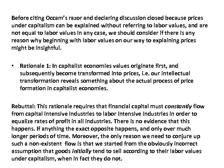 Before citing Occam’s razor and declaring discussion closed because prices under capitalism can be explained without referring to labor values, and are not equal to labor values in any case, we should consider if there is any reason why beginning with labor values on our way to explaining prices might be insightful. • Rationale 1: In capitalist economies values originate first, and subsequently become transformed into prices, i. e. our intellectual transformation reveals something about the actual process of price formation in capitalist economies. Rebuttal: This rationale requires that financial capital must constantly flow from capital intensive industries to labor intensive industries in order to equalize rates of profit in all industries. There is no evidence that this happens. If anything the exact opposite happens, and only over much longer periods of time. Moreover, the only reason we need to conjure up such a non-existent flow is that we started from the obviously incorrect assumption that goods initially tend to sell according to their labor values under capitalism, when in fact they do not.