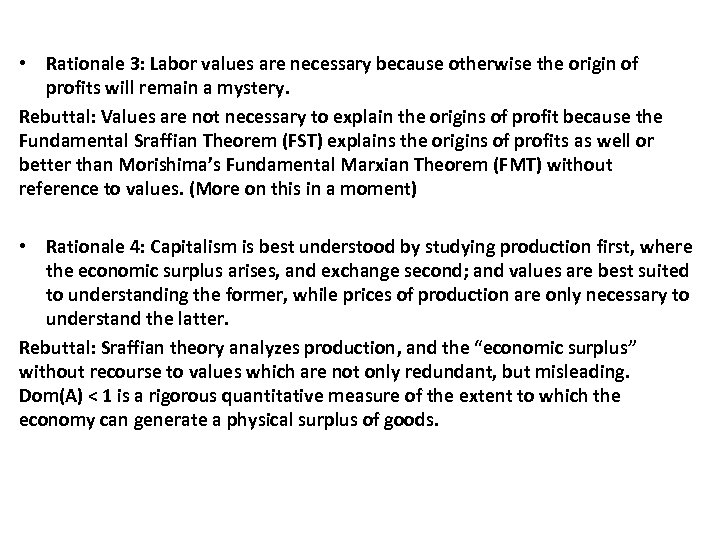 • Rationale 3: Labor values are necessary because otherwise the origin of profits will remain a mystery. Rebuttal: Values are not necessary to explain the origins of profit because the Fundamental Sraffian Theorem (FST) explains the origins of profits as well or better than Morishima’s Fundamental Marxian Theorem (FMT) without reference to values. (More on this in a moment) • Rationale 4: Capitalism is best understood by studying production first, where the economic surplus arises, and exchange second; and values are best suited to understanding the former, while prices of production are only necessary to understand the latter. Rebuttal: Sraffian theory analyzes production, and the “economic surplus” without recourse to values which are not only redundant, but misleading. Dom(A) < 1 is a rigorous quantitative measure of the extent to which the economy can generate a physical surplus of goods.