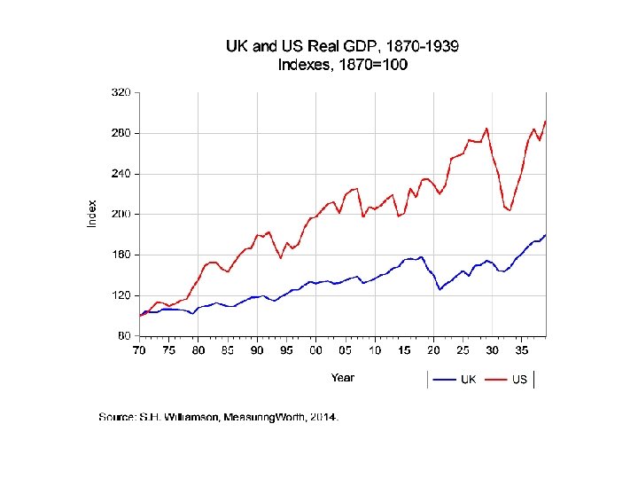 Real GDP per Capita of World Leader (1990 dollars; leader in red) 1820 1870 1913 1950 Netherlands 1, 838 2, 757 4, 049 5, 996 UK 1, 706 3, 190 4, 921 6, 939 US 1, 257 2, 445 5, 301 9, 561 1. 8 8. 9 18. 9 27. 3 US share of world GDP Source: Angus Maddison, Contours of the World Economy, 2 -2030 AD