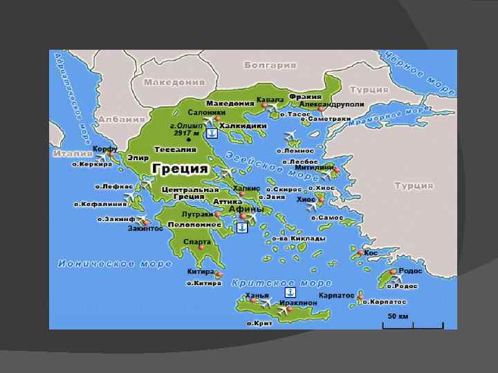 Характеристика государства Территория Греции может быть разделена на три части: материковая Греция, в состав которой входят Македония (Флорина, славянское название Лерин, Пелла Кавала, Кастория, Халкидики и др), Фракия (Родопи, Ксанти и Эврос), Эпир(Теспротия, Превеза Янина и др), Фессалия (Лариса, Магнисия и др) и Центральна Греция (Фтиотида, Фокида, Аттика и др). Также географически к этому региону можно отнести. Ионические острова; Греция расположена в южной части Балканского полуострова и на прилегающих к нему и к побережью Малой Азии островах и занимает площадь 131 994 км². Граничит с Албанией, бывшей Югославской Македонией, Болгарией и Турцией. Омывается Средиземным морем, в том числе: Ионическим, Эгейским морями, а южное побережье Крита — Ливийским морем. В состав Греции входит около 2 тысяч островов, на которые приходится почти 20 % всей страны. Пелопоннес — крупнейший полуостров Греции и очаг древнейшей цивилизации Европы, включает номы Аркадия, Лакония, Мессиния и т. д. Здесь же расположен знаменитый. Коринфский канал, прорытый французской фирмой для греческого государства в XIX веке; острова Эгейского моря, крупнейшими из которых являются Крит — крупнейший остров Греции и восьмой в Европе (8259 км²) и Эвбея — второй по величине, после Крита, остров Греции (3654 км²), соединенный с континентом мостом, переброшенным через пролив Эврип, а также Лесбос (1630 км²), расположенный у берегов Турции. Также здесь расположено множество групп небольших островов — Северные Спорады, Киклады, Додеканес. Греки — стареющая нация. Прирост населения по состоянию на 2010 год составляет 0, 106 %. Рождаемость — 9, 34 (для сравнения в 2008 — 9, 54) на 1000 человек, смертность — 10, 6 (для сравнения 2008 — 10, 42) на 1000 человек. Среднее количество детей, которое за свою жизнь рожает 1 женщина — 1, 37 (для сравнения 2008 года — 1, 36) ребенка о состоянию на 1 января 2010 года, по данным организации «Евростат» , в Греции проживало 11 295 002 человек [1], по этому показателю Греция занимает 74 место в мире