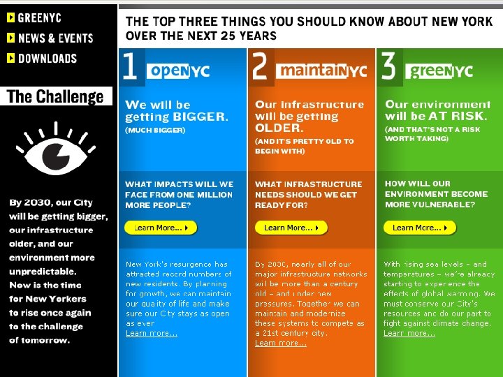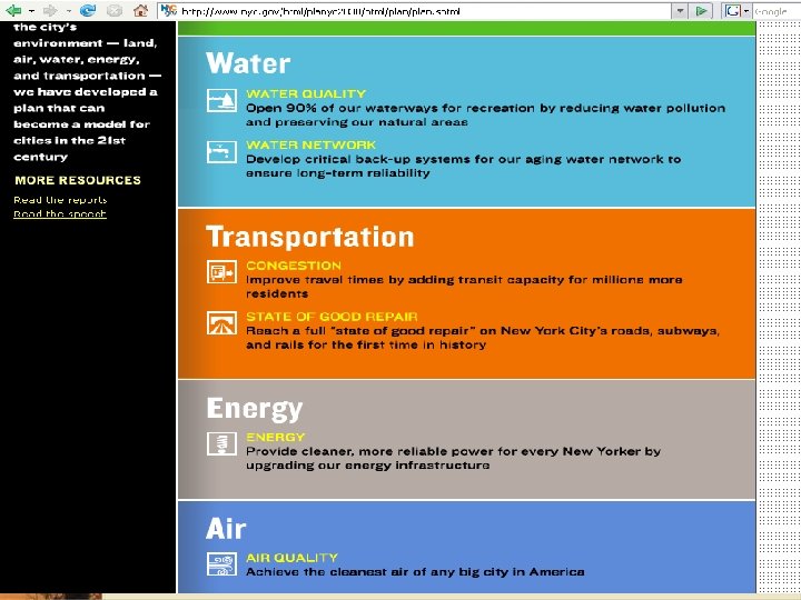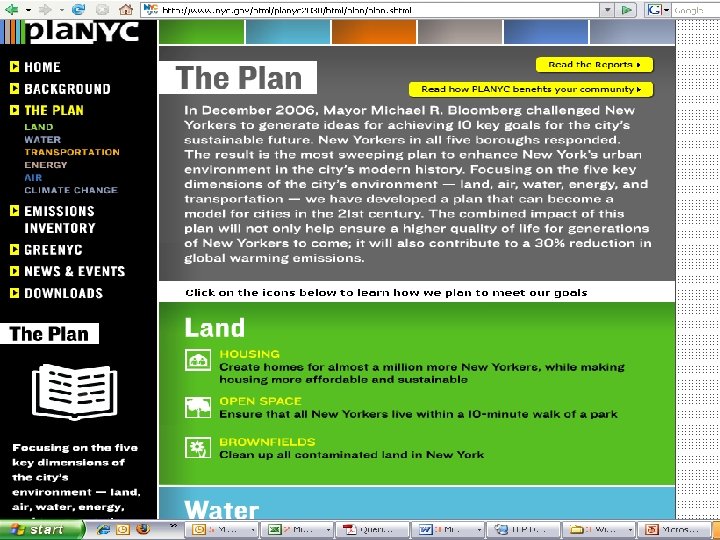 Pla. NYC – A Greener Greater New York Action - Attract 900, 000 new residents by 2030 to achieve an avoided 15. 6 million metric tons of carbon emission 1. Create sustainable, affordable housing 2. Provide parks near all New Yorkers 3. Expand improve mass transit 4. Reclaim contaminated land 5. Open our waterways for recreation 6. Ensure a reliable water and energy supply 7. Plant trees to create a healthier and more beautiful public realm