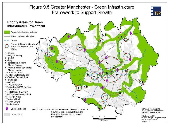 Towards a GI Framework 1. Spatial Framework – where is investment needed to safeguard and create assets; and to sustain functions 2. Organisational Framework – who will advocate for GI activity, stimulate new initiatives and support deliverers “Green Infrastructure will be delivered through a few large projects and a thousand smaller actions”