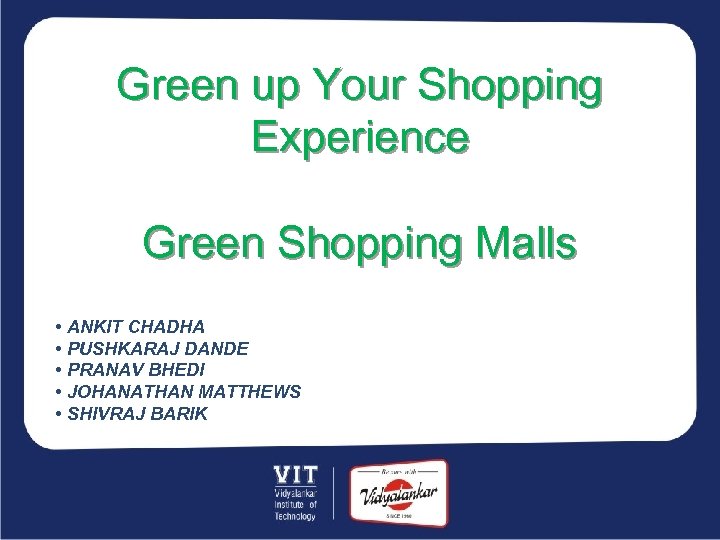 Green up Your Shopping Experience Green Shopping Malls • ANKIT CHADHA • PUSHKARAJ DANDE • PRANAV BHEDI • JOHANATHAN MATTHEWS • SHIVRAJ BARIK