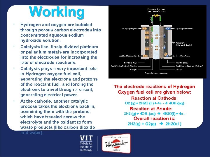 Working § § Hydrogen and oxygen are bubbled through porous carbon electrodes into concentrated aqueous sodium hydroxide solution. Catalysts like, finely divided platinum or palladium metals are incorporated into the electrodes for increasing the rate of electrode reactions. Catalysis plays a very important role in Hydrogen oxygen fuel cell, separating the electrons and protons of the reactant fuel, and forcing the electrons to travel though a circuit, generating electrical power. At the cathode, another catalytic process takes the electrons back in, combining them with the protons, which have traveled across the electrolyte and the oxidant to form waste products (like carbon dioxide and water). The electrode reactions of Hydrogen Oxygen fuel cell are given below: Reaction at Cathode: O 2 (g) + 2 H 2 O (l ) + 4 e - 4 OH-(aq) Reaction at Anode: 2 H 2 (g) + 4 OH–(aq) 4 H 2 O(l) + 4 e– Overall reaction is: 2 H 2(g) + O 2(g) 2 H 2 O(l )