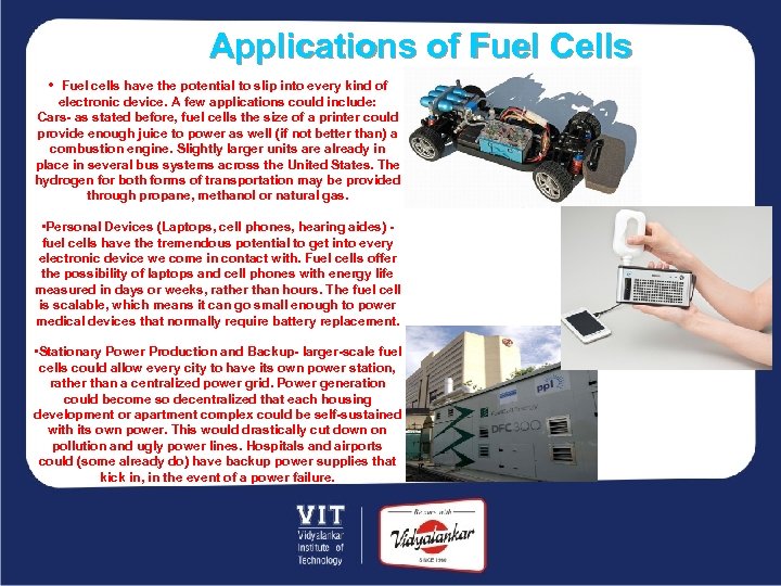 Applications of Fuel Cells • Fuel cells have the potential to slip into every kind of electronic device. A few applications could include: Cars- as stated before, fuel cells the size of a printer could provide enough juice to power as well (if not better than) a combustion engine. Slightly larger units are already in place in several bus systems across the United States. The hydrogen for both forms of transportation may be provided through propane, methanol or natural gas. • Personal Devices (Laptops, cell phones, hearing aides) - fuel cells have the tremendous potential to get into every electronic device we come in contact with. Fuel cells offer the possibility of laptops and cell phones with energy life measured in days or weeks, rather than hours. The fuel cell is scalable, which means it can go small enough to power medical devices that normally require battery replacement. • Stationary Power Production and Backup- larger-scale fuel cells could allow every city to have its own power station, rather than a centralized power grid. Power generation could become so decentralized that each housing development or apartment complex could be self-sustained with its own power. This would drastically cut down on pollution and ugly power lines. Hospitals and airports could (some already do) have backup power supplies that kick in, in the event of a power failure.