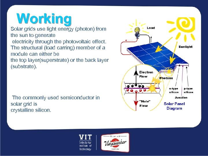 Working Solar grids use light energy (photon) from the sun to generate electricity through the photovoltaic effect. The structural (load carring) member of a module can either be the top layer(superstrate) or the back layer (substrate). The commonly used semiconductor in solar grid is crystalline silicon.
