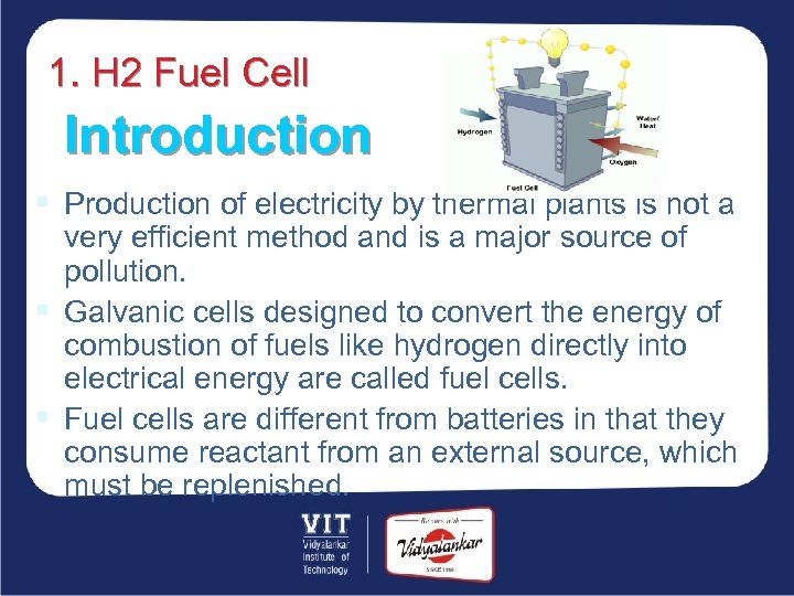 1. H 2 Fuel Cell Introduction § Production of electricity by thermal plants is not a very efficient method and is a major source of pollution. § Galvanic cells designed to convert the energy of combustion of fuels like hydrogen directly into electrical energy are called fuel cells. § Fuel cells are different from batteries in that they consume reactant from an external source, which must be replenished.