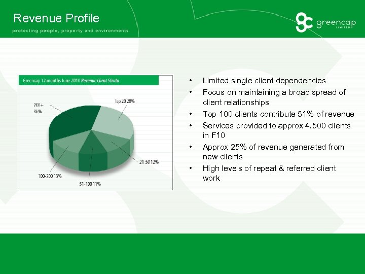 Revenue Profile • • • Limited single client dependencies Focus on maintaining a broad spread of client relationships Top 100 clients contribute 51% of revenue Services provided to approx 4, 500 clients in F 10 Approx 25% of revenue generated from new clients High levels of repeat & referred client work